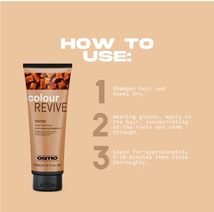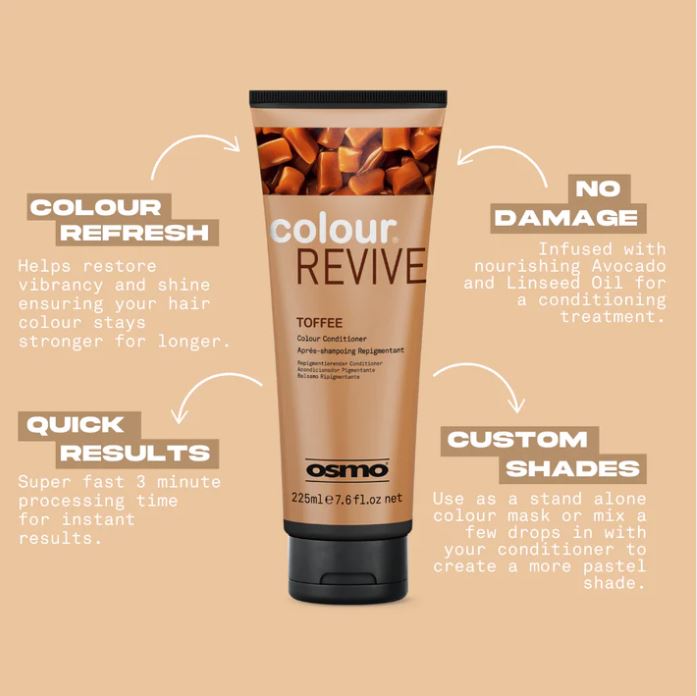 Osmo Colour Revive Toffee restores warm blonde tones with cool undertones in just 3 minutes, boosting colour, shine, and nourishment for colour-treated hair.
