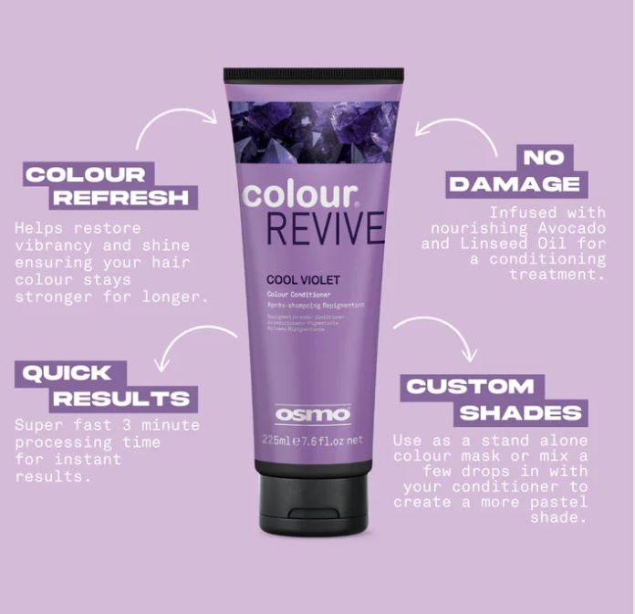 Re-energize your salon colour and help fight the fade with Colour Revive Violet intense colour conditioning treatment. With a superfast 3 minute processing time, Colour Revive’s nourishing Avocado and Linseed Oil infused formula helps restore vibrancy and shine ensuring your hair colour stays stronger for longer. Perfect for using between salon colour appointments. Completely cruelty-free.