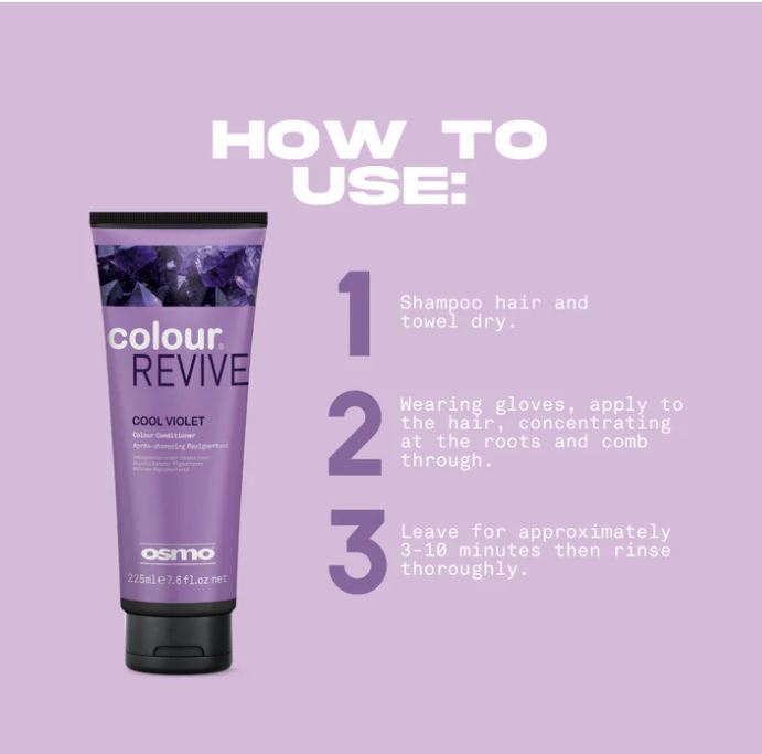 Shampoo hair and towel dry. Wearing gloves, apply Colour Revive to the hair, concentrating at the roots and comb through. Leave for approximately 3-10 minutes. Rinse thoroughly.