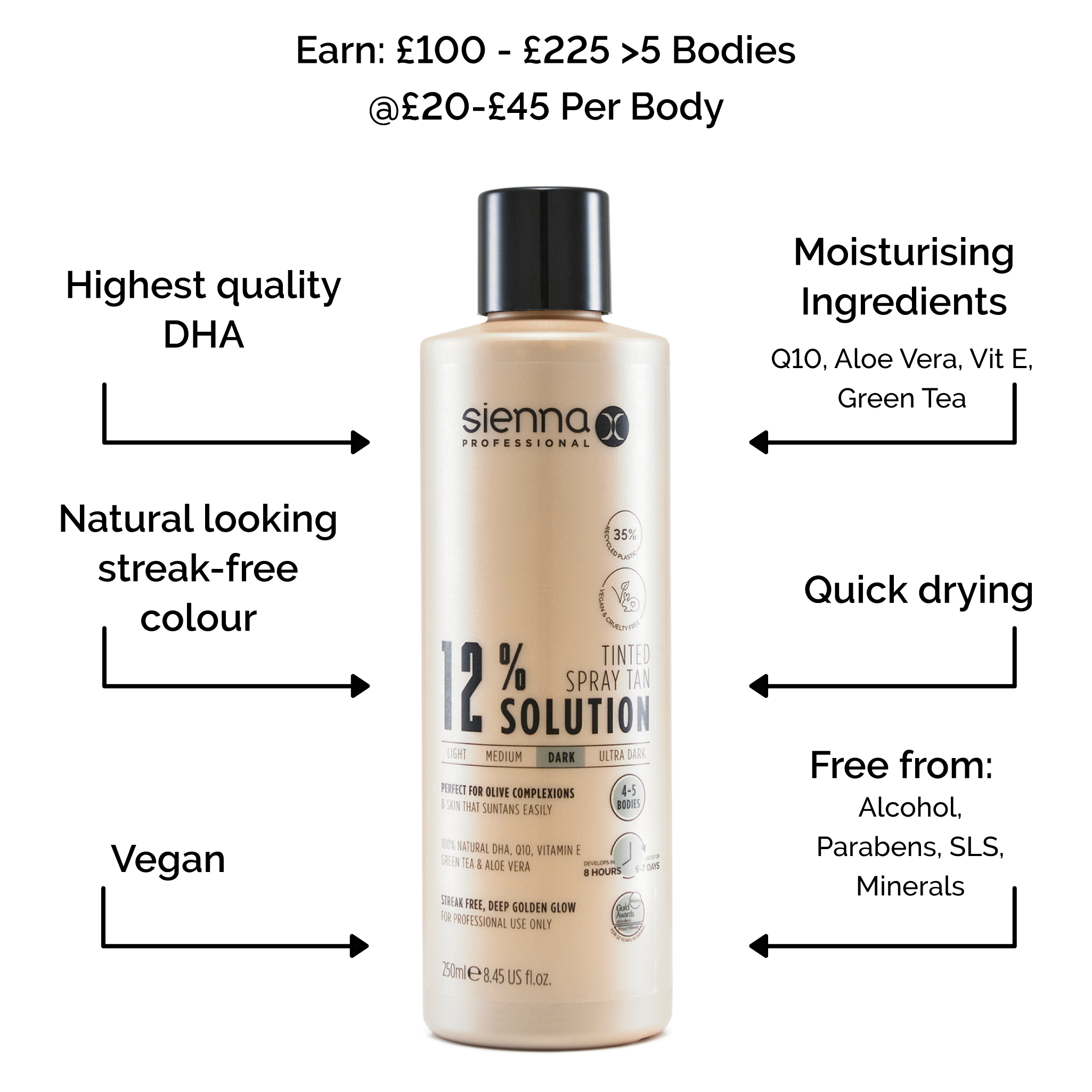 Introducing the Sienna X 12% DHA Vegan Spray Tan Solution, designed for those desiring a rich, dark, and natural-looking tan.